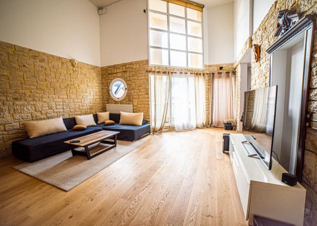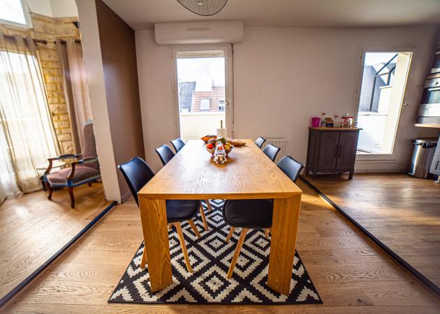 Salon et séjour cathédrale très lumineux, entièrement meublés donnant sur un balcon traversant pour passer de bons moments autour d'une table de jardin avec ses chaises.
