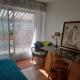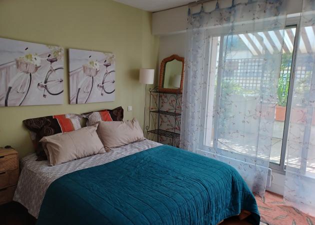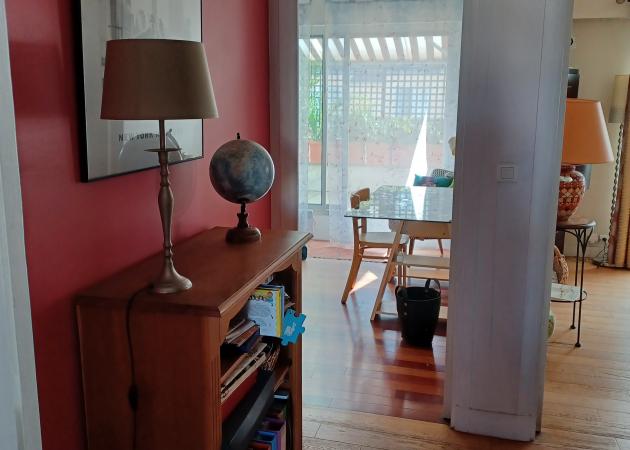 La baie vitrée donne sur une terrasse arborée et fleurie, mais celle-ci ne fait pas partie de l’espace proposé à la location.