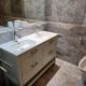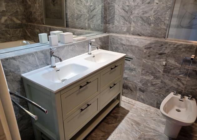 • Une salle de bains avec baignoire, lavabo double, bidet ainsi qu’une poubelle à pédale et d’un nécessaire pour éponger le sol.