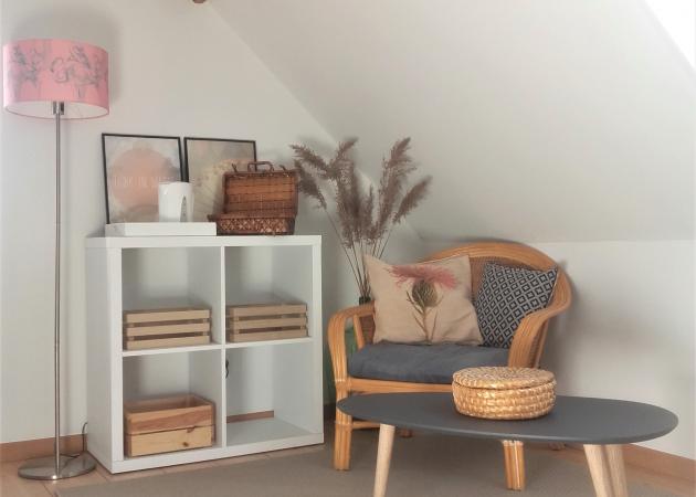Dans la chambre: 1 lit double (140x190 cm) confortable de qualité, avec protection de matelas, couette, oreillers fournis. Une penderie, 1 commode multi tiroirs, 1 table basse, radiateur à inertie sèche. Accès au Wifi fibre.