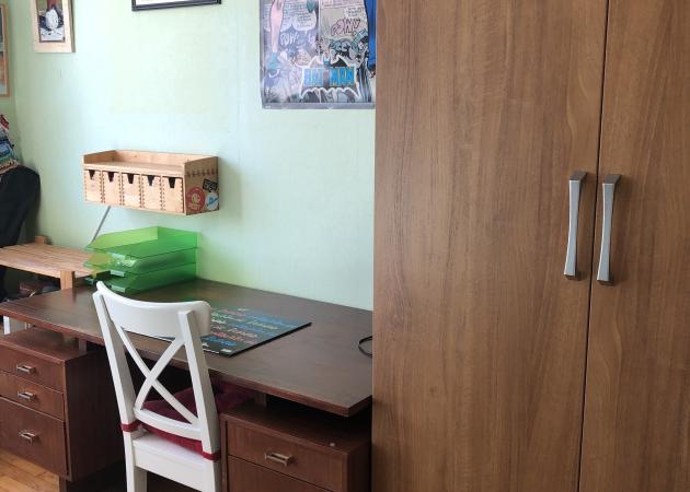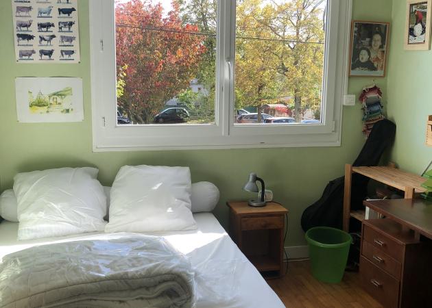 Je propose une chambre à l’étage de ma maison. La chambre a un grand lit, une armoire et un bureau. Elle est très lumineuse. Il y a aussi une salle de bain et des WC réservés à la chambre.