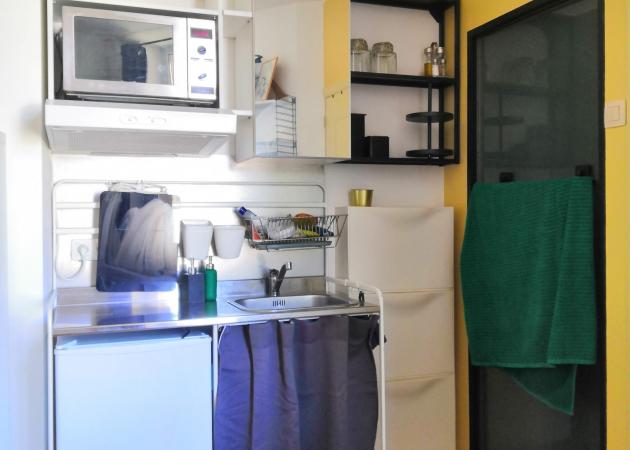 L'espace est de 15m2 et possède toutes les commodités : kitchenette, douche, toilettes, un canapé-lit, une table d'appoint, une chaise et un meuble dressing.