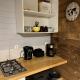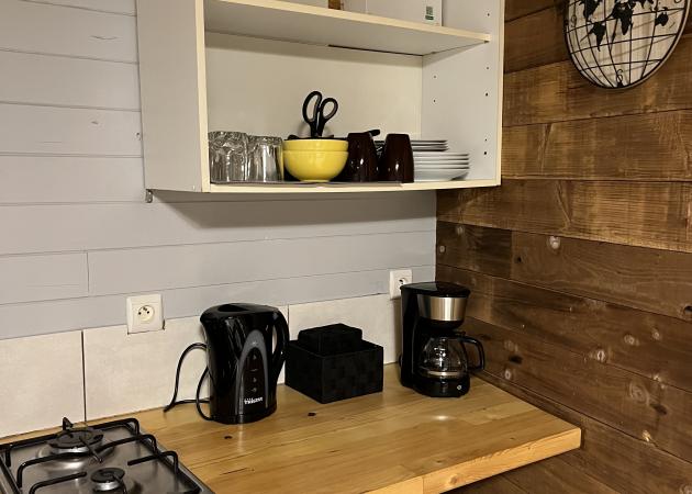 Coin cuisine avec plaques électriques , réfrigérateur, vaisselle pour deux personnes.