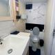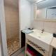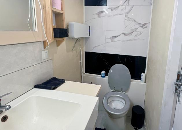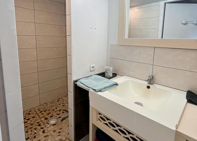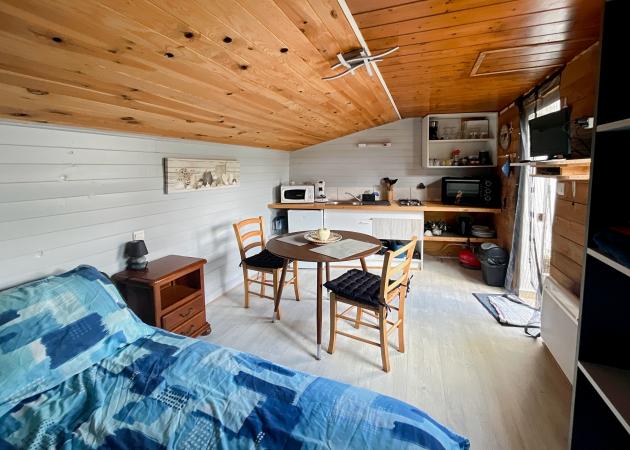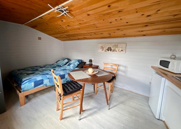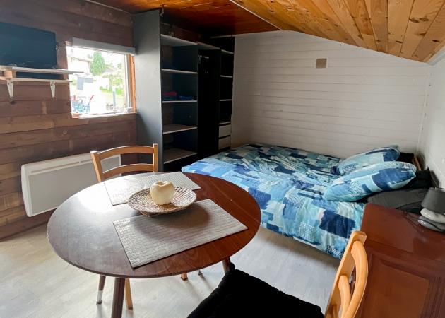 Studio équipé de lit deux personnes, salle de bains indépendante avec douche avec douche, lavabo une vasque et wc.