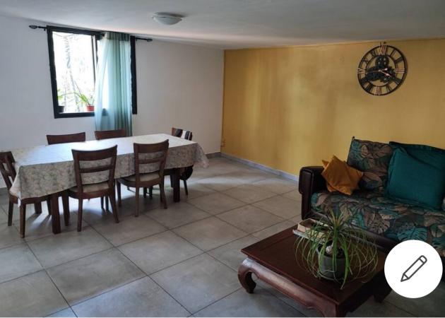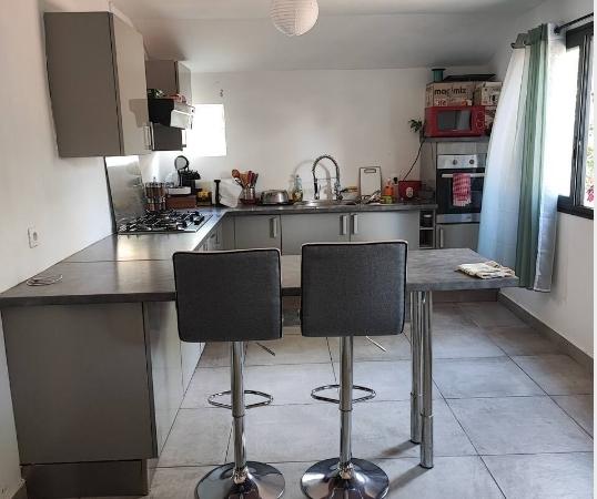 Espace commun partagé : séjour, cuisine, sanitaire, jardin.