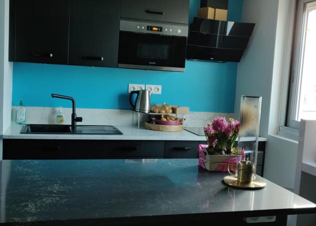 Mon appartement est un 2 pièces de 43 m² avec entrée, WC séparés, cuisine ouverte sur séjour.