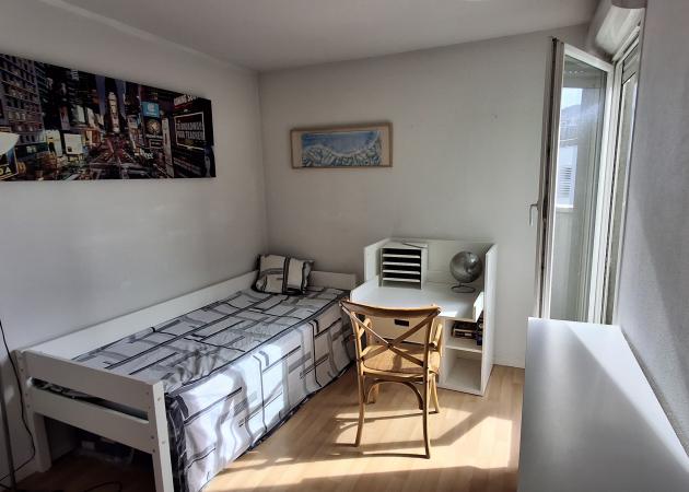 Une chambre est occupée par une jeune fille et l'autre chambre est disponible.