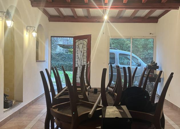Maison de caractère comprenant cuisine équipée, salle à manger et salon.