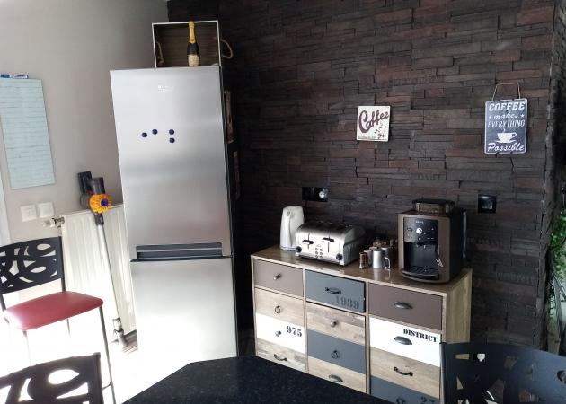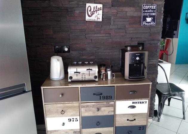 Dans la cuisine, il y a une machine à café en grain à disposition pour le petit-déjeuner et dans la journée. Vous avez plusieurs sortes de thé ou tisane idem pour votre petit déjeuner ou à tout moment de la journée.