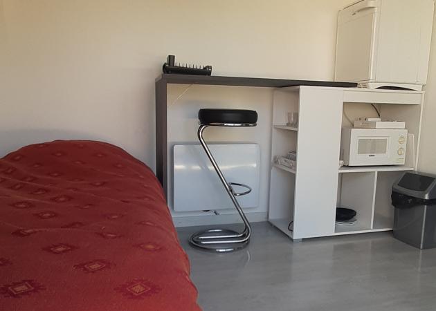 Equipé d'un lit 90x180, d'un petit frigidaire, micro ondes et bouilloire. Une salle d'eau, avec douche, WC et lavabo.