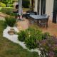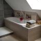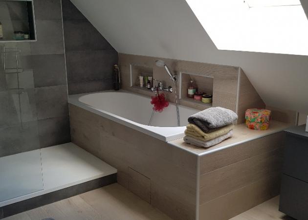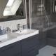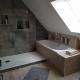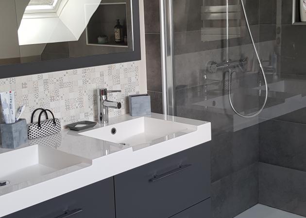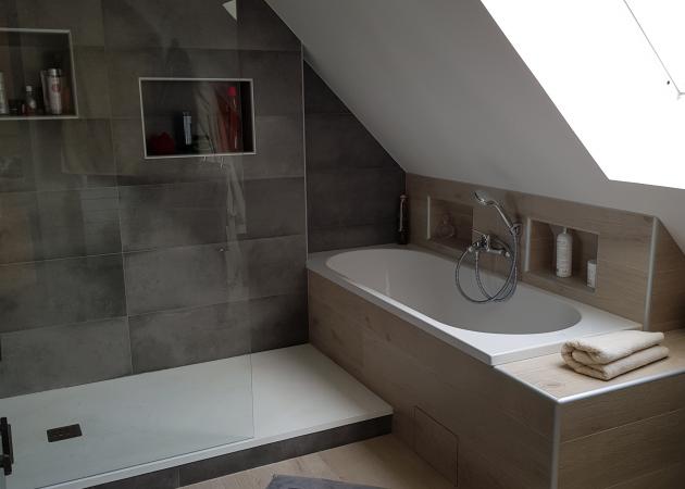 Salle de bain partagée avec double vasque, douche italienne et baignoire.