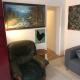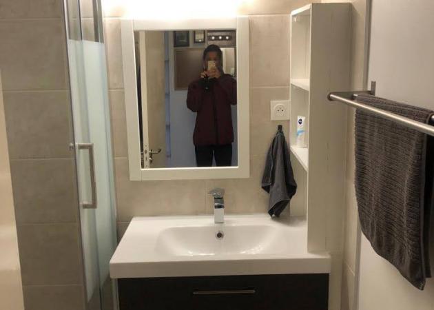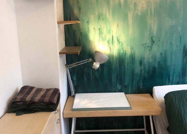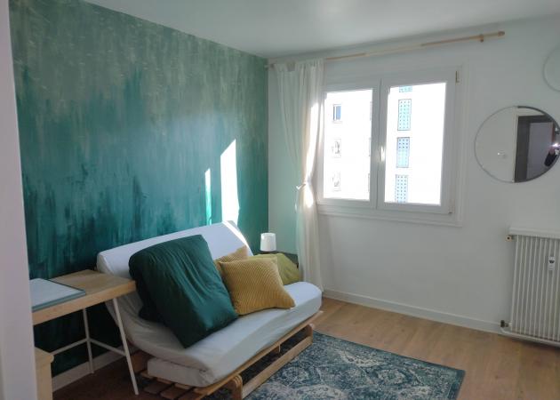 La chambre est lumineuse, meublée, soigneusement équipée : lit double (clic-clac pour profiter de l'espace), bureau & chaise, table basse, rangements, luminaires, miroir, draps & serviette, tapis, rideaux.