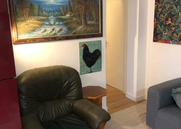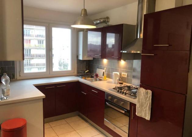 L'appart est fraîchement refait avec une grande cuisine ouverte/ salon et des toilettes séparées de la salle d'eau. Il est entièrement équipé (plaques de cuisson gaz, frigo, lave-vaisselle, lave-linge, box, bouilloire, couverts...). Il dispose d'une cave, d'un balcon et d'arceaux vélo devant l'entrée de l'immeuble. La résidence est calme et il y a un grand espace vert au pied de l'immeuble. Badge parking possible en supplément.