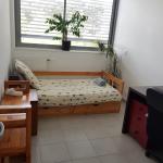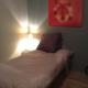 La chambre est petite ( a cause du coin douche et lavabo à l’intérieur ) mais confortable ! Il y a un petit lit une commode et un dressing un bureau
