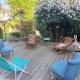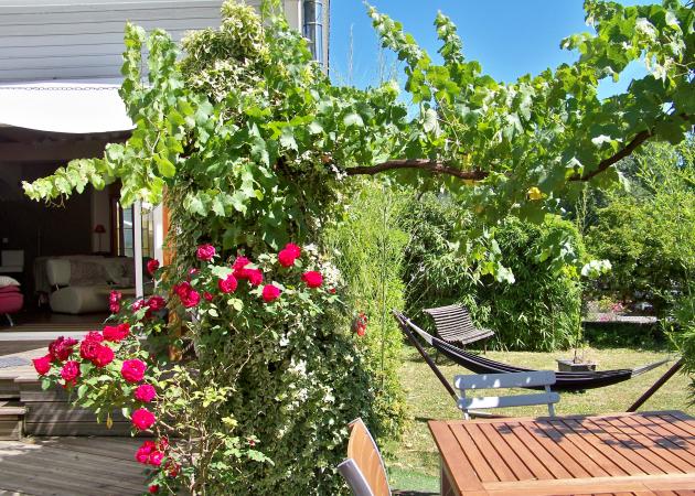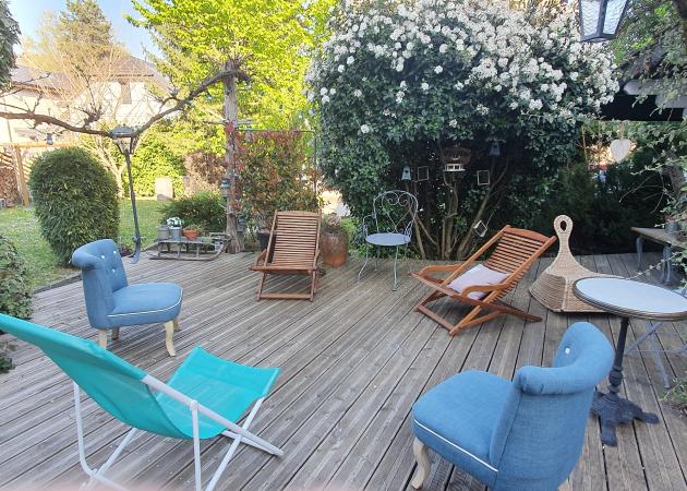Grande terrasse et jardin arborisé intime pour se reposer.