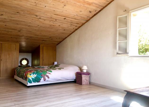 -1) Chambre de charme, spacieuse: lit double 180x200cm excellente literie neuve, TV, 2 fenêtres est et sud-ouest, placard, table basse avec poufs, bureau, étagères (26m2 dont petite partie plus basse sous plafond),