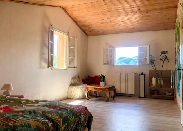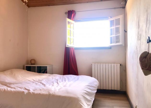 - 2) Jolie chambre : lit double 140x190cm, avec étagères, une fenêtre expo sud-ouest donnant sur la vallée (10m2),
