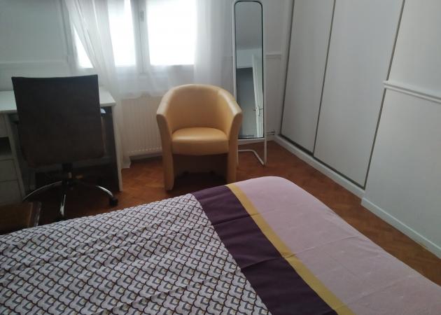 Table de chevet, lit 120, grand bureau et chaises, rangements, bibliothèque. Double vitrage, exposition ouest, , environnement très calme. Chambre lumineuse.