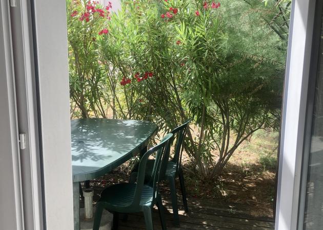 Terrasse avec parasol et salon de jardin, barbecue électrique. Climatisation réversible et chauffage électrique.
