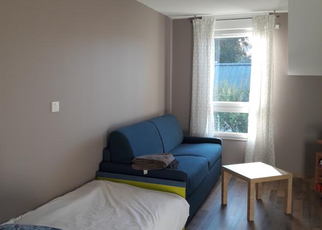 Grande chambre comprenant 1 lit de 140 et un lit de 90, un canapé, un dressing et une bibliothèque.