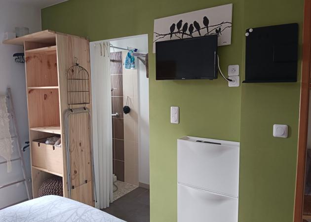 télé connectée,coin bureau,dressing, étendoir,rangements.