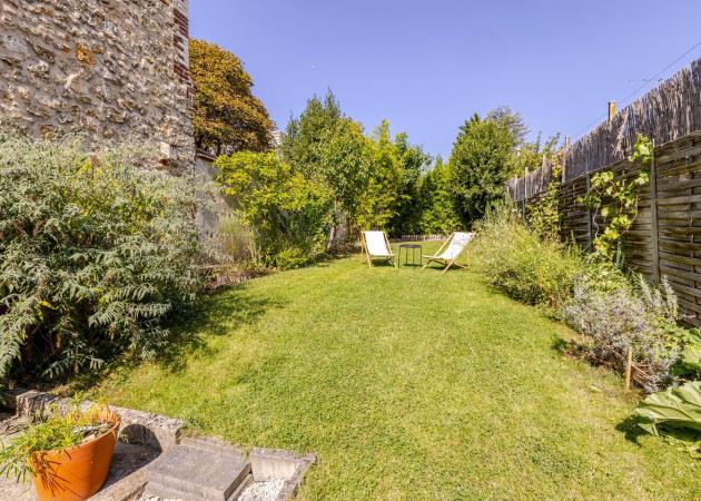 - Terrasse avec jardin sans vis à vis avec salon de jardin, table, barbecue, transats et prise extérieures pour travailler dehors