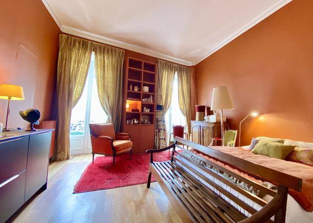 Un joli studio avec parquet, un grand lit, une cuisine équipée, une vraie salle de bain et deux grandes portes fenêtres donnant sur la rue.