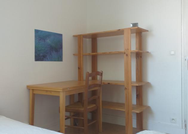 La chambre est équipé d’un lit de 90, d’une armoire, d’un bureau et d’étagères.