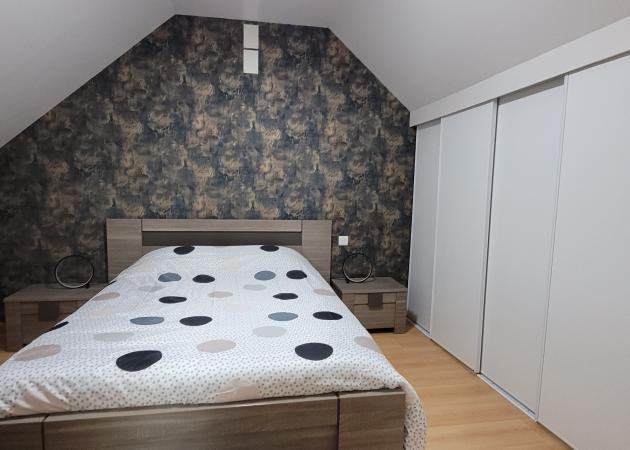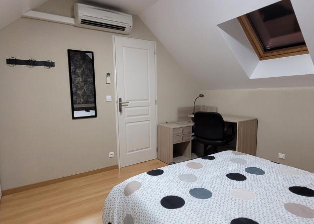 La chambre (privative) est située au 1er étage de l'habitation, avec une cuisine, un salon TV et une salle de bain qui peuvent être éventuellement partagés avec une deuxième chambre en location.