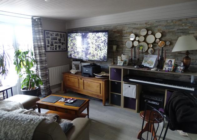 Salon convivial avec grand écran (1,60 m), canapé et poêle à granulés