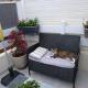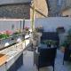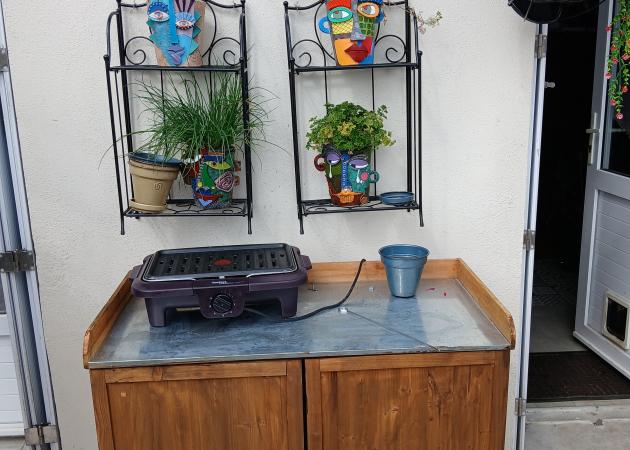 Jardin et terrasse aménagés avec salon de jardin et barbecue électrique.