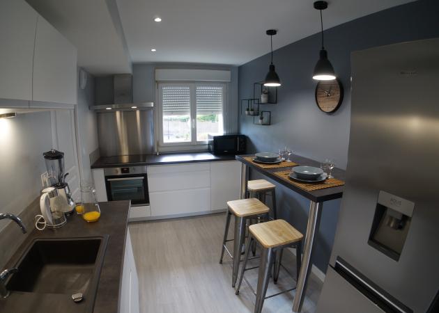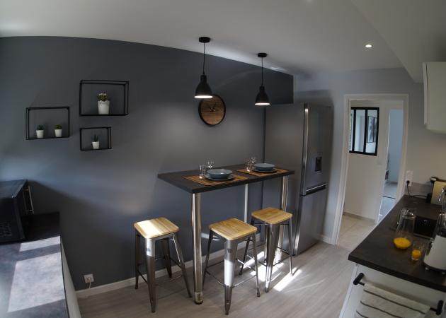 -Une grande cuisine équipée d’un réfrigérateur, plaque vitro céramique, micro-ondes, machine à café, blender, ustensiles de cuisine…