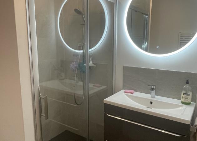 Salle d’eau privative en annexe, avec WC suspendu, meuble vasque, receveur de douche extra plat de 1m20x0,90 m.