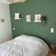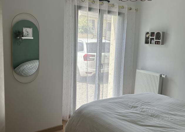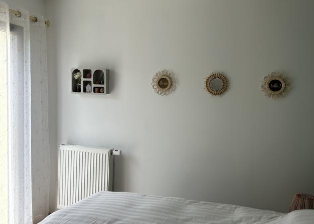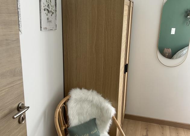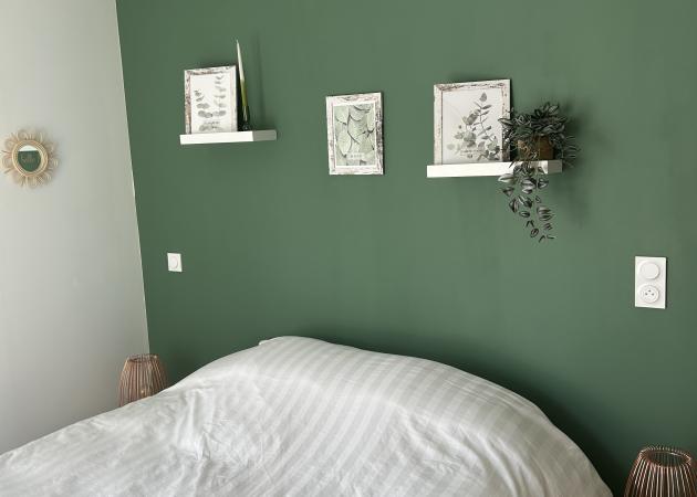 Chambre de 13m2, au rez-de-chaussée, avec porte fenêtre en aluminium, et volet roulant électrique. Chauffage radiateur à eau. Sol en stratifié. Placo et porte isophonique de très bonne facture. Lit de 160x200 cm avec très bon matelas.