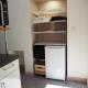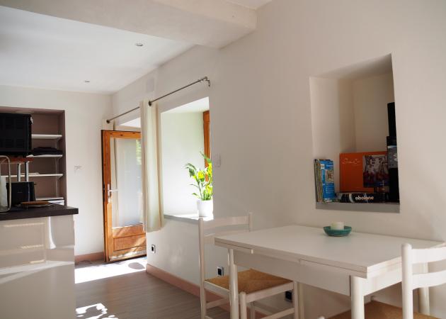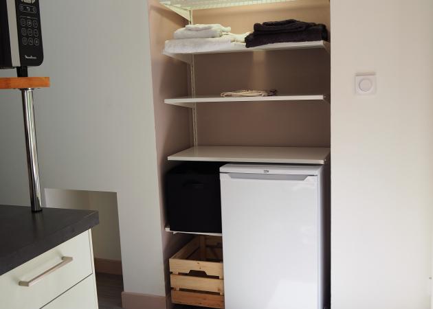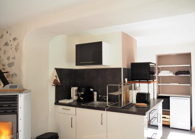 Il comprend 1 petit réfrigérateur, 1 plaque de cuisson, un mini-four, 1 évier, 1 machine expresso, 1 bouilloire, 1 grille pain et de la vaisselle. Une petite table avec 2 chaises.