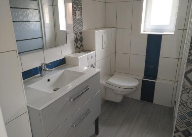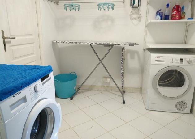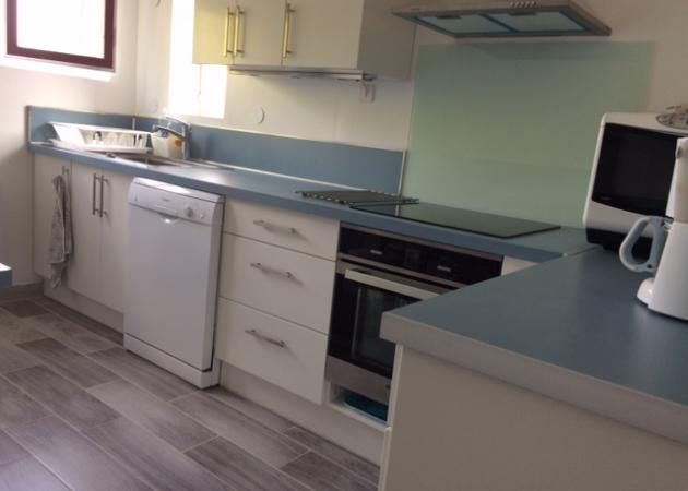Cuisine aménagée équipée, salon avec bibliothèque, TV et fibre optique.
