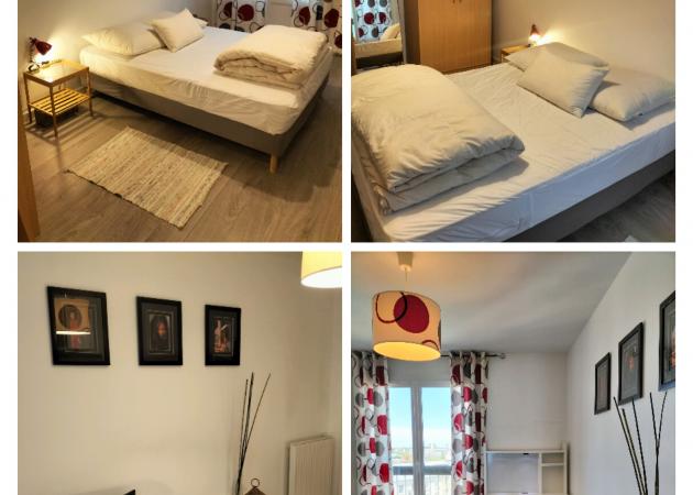 La chambre de 12 m2 comprend : - 1 Armoire / Rangement / Penderie - 1 lit double 140 cm (matelas, couette, oreillers, seul les draps ne sont pas fournis) - 1 Bureau - 1 chaise de Bureau – 1 meuble TV et TV connectée à la Chromecast – 1 grand miroir – 2 tables de chevet et lampe – 2 tapis – rideaux occultants…