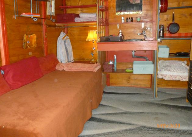 À l'intérieur, le chalet offre un espace cuisine, un lavabo ainsi qu'un canapé convertible en lit. La douche et les toilettes sont à partager avec les hôtes.