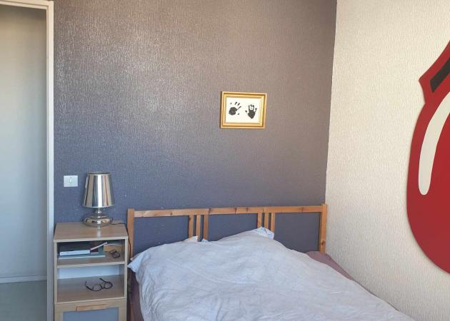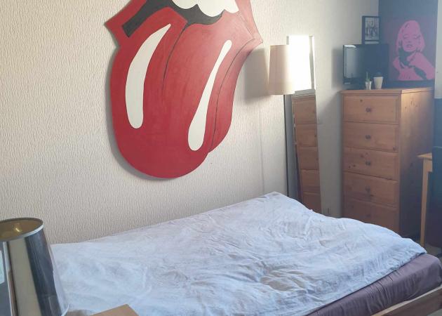 La chambre dispose d'un lit double, d'une table de nuit, d'un bureau, d'une chaise de bureau, de plusieurs rangements (commode, étagères, crochets, cintres...) pour vos affaires.