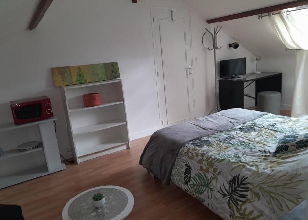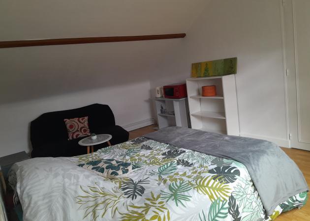 lit 2 personnes , clic clac , petite table , micro ondes et bouilloire , côté bureau, television , petit frigo ,salle de bain privatif côté baignoire et côté lavabo avec meuble et WC a côté de la chambre, au 1er étage d'une maison avec terrasse. Arret bus en face de la maison et le tram a 500 m . Idéale pour étudiant en alternance et stagiaire . Wifi et parking. Linge non fourni et accès cuisine pour repas. Chambre non fumeur .