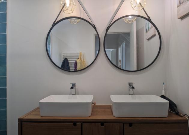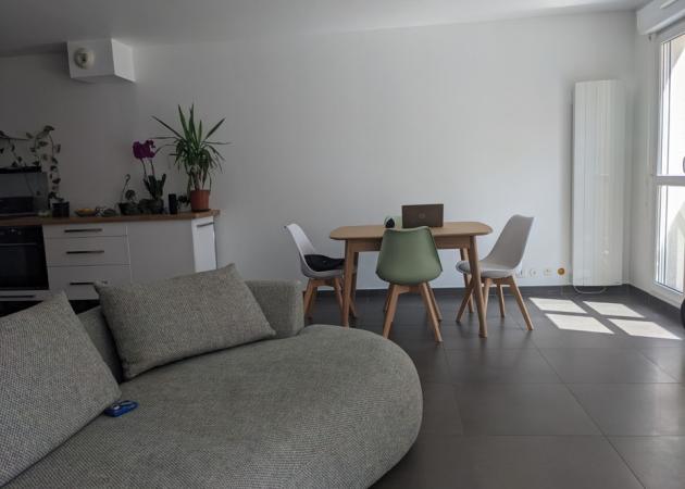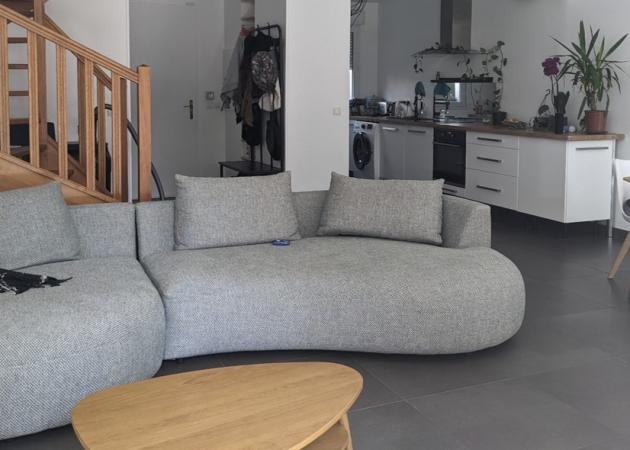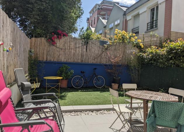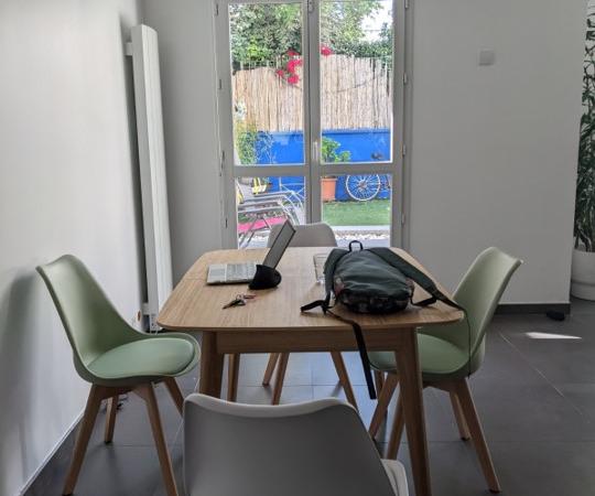 Grand salon cuisine qui donne sur le jardin / terrasse où il fait bon lire un bouquin, boire son café ou dîner. Le voisinage est sympa