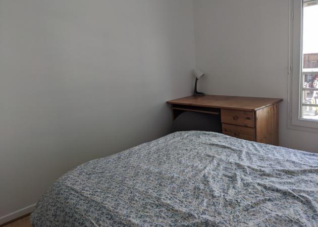 La chambre fait 10 m2 : un lit double / canapé avec un matelas pour couchage quotidien (se plie et se déplie en un mouvement) + bureau + armoire.