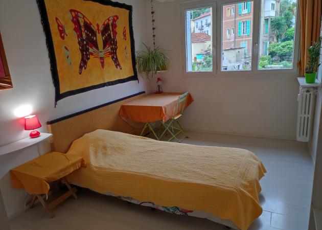A louer dans un appartement T3 situé au 7éme étage d’un immeuble sécurisé avec ascenseur, 1 chambre avec 1 lit simple, très calme, ensoleillée, lumineuse donnant sur les collines de Nice ouest. Placard dans la chambre, étagères, table et chaise. Appartement fonctionnel, entièrement équipé, non fumeur où vit un chat. Le linge de maison est fourni. Cuisine et salle de bain à partager; toilettes séparées.
