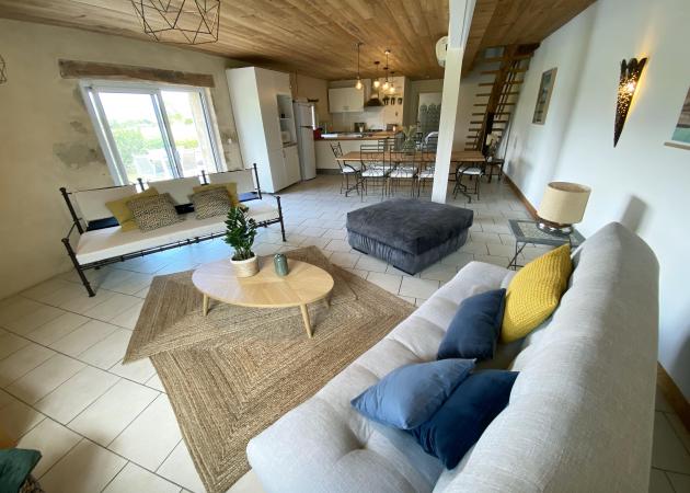 En commun avec un autre locataire, vous disposez d'une salle de bain avec douche et baignoire, d'un grand séjour coin TV, grande table et cuisine américaine toute équipée.