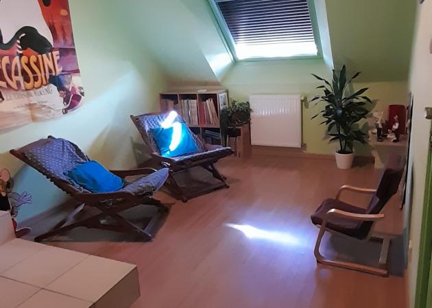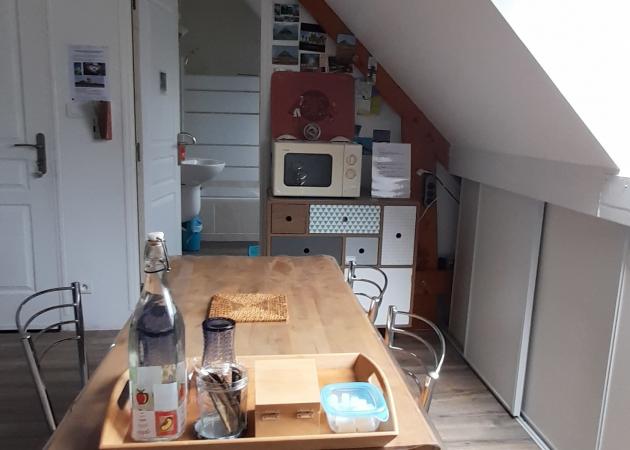 Elle comprend une grande chambre de 25m2 avec 1 lit 2 places et 1 lit 1 place, un coin pour prendre votre repas (SANS CUISINE) avec table chaises petit frigo/congel neuf, micro-onde et bouilloire, couverts, mugs, thé tisane et café à disposition. ..Une salle de bain attenante (douche uniquement) avec pare-douche, gel douche et shampoing fournis . Wc séparé. Une mezzanine (frigo) , place du 2ème lit 1 place et une pièce bibliothèque pour vous détendre et bouquiner (place pour 2eme lit 2 places) Possibilité de venir avec 1 bébé (materiel fournis : chaise haute, lit parapluie, jeux....)sur demande..