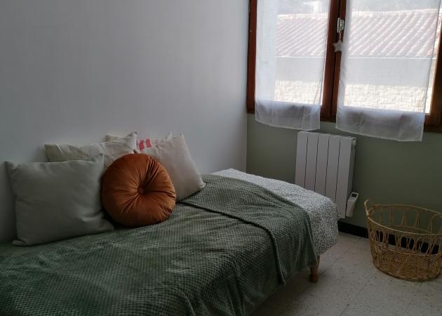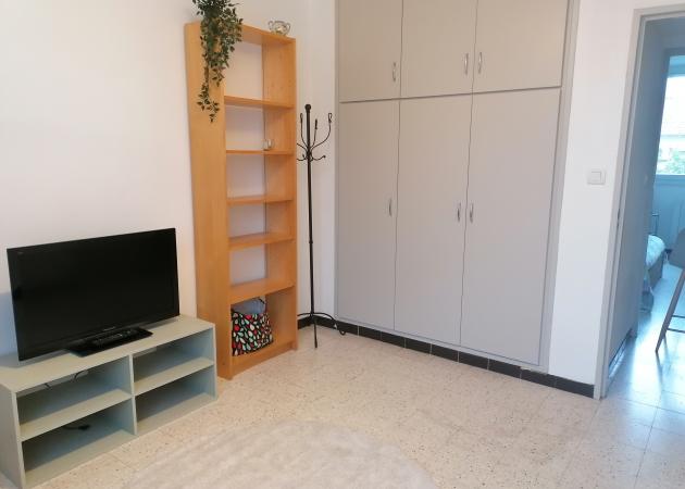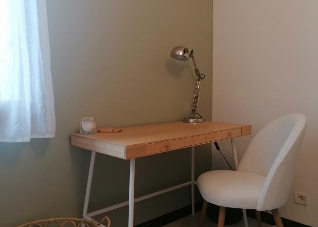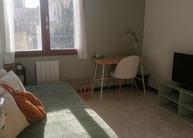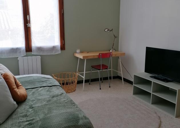 La chambre est lumineuse, disposant d'un lit une place confortable (draps et couette fournis), d'un meuble télé/télévision, d'un joli bureau et d'une grande penderie.