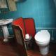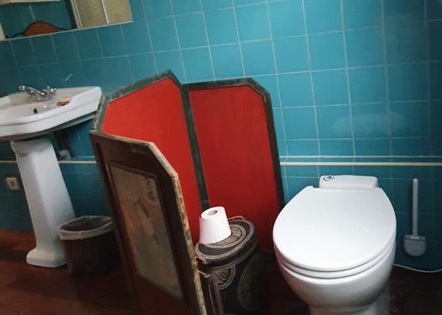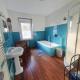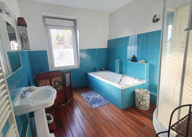 - salle de bains de 10m2 avec grande baignoire, lavabo et WC, petites armoires, étagère.