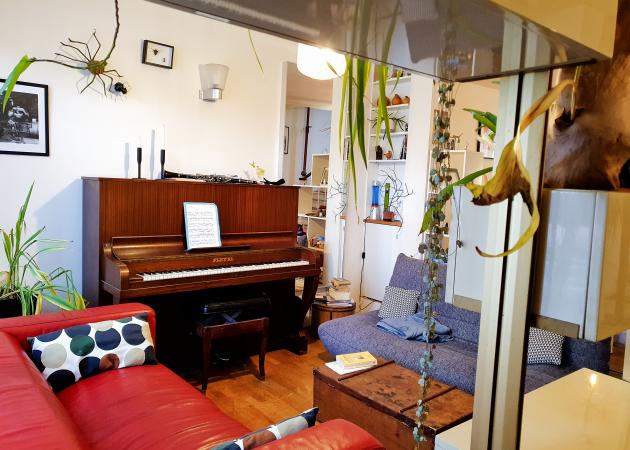La cuisine, le salon et la cour extérieure de cette grande maison sont partagés avec une maman, deux adolescents, un chat et un piano.