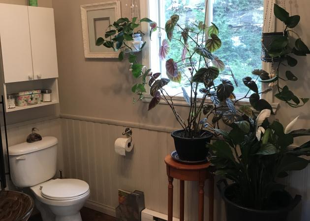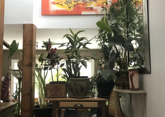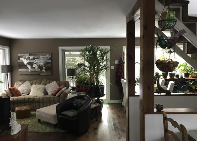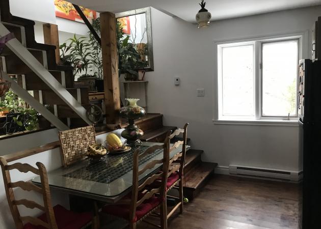 Au rez-de -chaussée, on y retrouve la cuisine complètement aménagée, la salle à manger, un coin bureau, beaucoup de plantes intérieures, une bibliothèque contenant plusieurs livres sur le développement personnel ainsi que le salon avec le foyer et une TV avec un Fire stick. Cet espace serait partagé et j’y verrais un bel endroit pour du coworking, échanger, s’amuser et bien sûr partager des repas.
