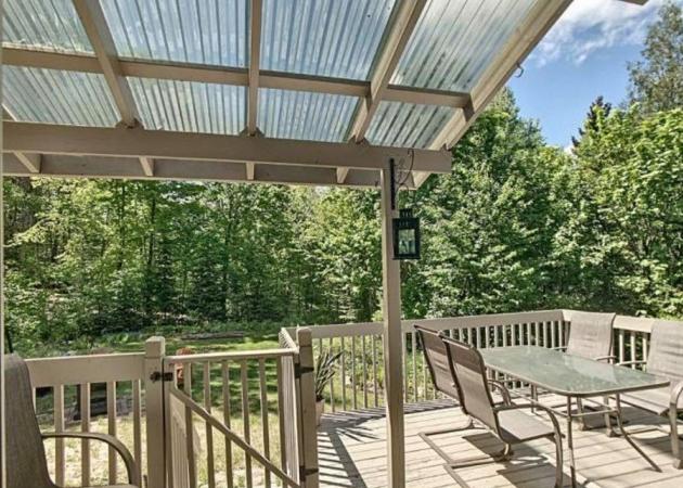 J’ai également un grand patio extérieur en bois avec une grande table pour partager des repas estivaux ainsi qu’un coin chaise berçante pour chiller dehors.